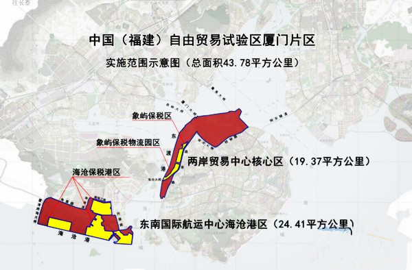 2014年12月12日,国务院决定设立中国(福建)自由贸易试验区,中国(福建)自由贸易试验区包括了福州片区、厦门和平潭片区。福建自贸区着重进一步深化两岸经济合作,总面积118.04平方公里,包括平潭片区43平方公里、厦门片区43.78平方公里、福州片区31.26平方公里。其中,平潭自贸区是福建自贸区的核心,平潭自贸区将重点建设自由港和国际旅游岛。