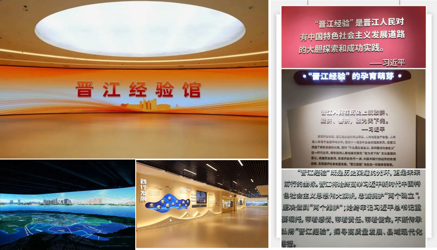 晋江市展馆&晋江经验馆位于福建省晋江市,是晋江对外宣传和展示城市形象的重要窗口,被誉为“晋江城市的会客厅”,是一座集晋江文化历史、产业发展、城市规划等方面于一体的展馆。馆内通过丰富的实物展示、多媒体展示和互动体验,生动地展现了晋江市在习近平总书记的关心和指导下,坚持以人民为中心的发展思想,推动经济社会发展取得的辉煌成就。馆内还展示了习近平总书记对晋江经验的高度评价和宣传报道,让参观者更加直观地了解到习近平总书记对晋江经验的推崇和肯定。